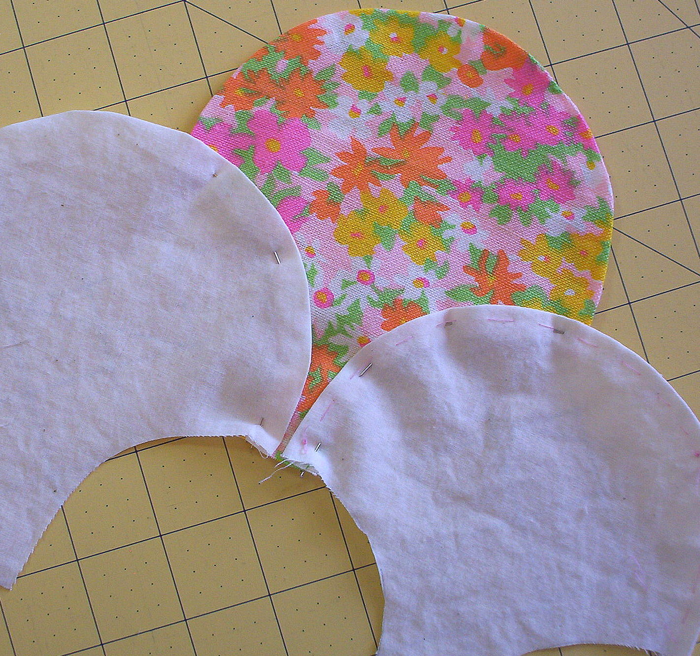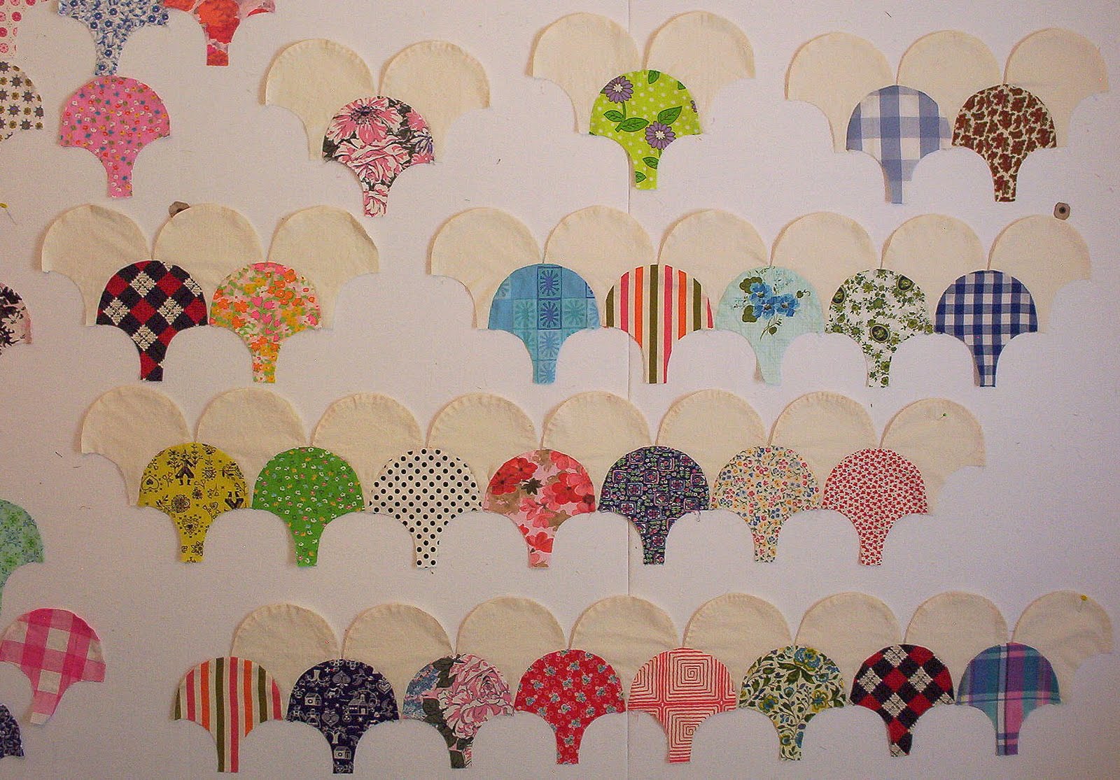 UPDATE: I ended up using dots of glue to piece the clam shells together instead of using the pinning method. You must be careful not to use too much glue or get the glue too close to the edges for it will make the fabric hard and you will not be able to get a needle into it. I liked the glue method. It made the pieces stay together a lot better and there was no slipping around with your placement.